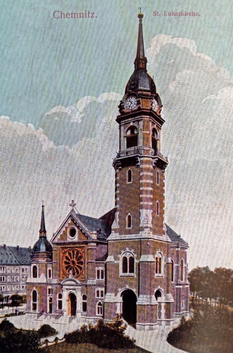 Unglaublich aber wahr: die erst 1888 fertig gewordene St. Petrikirche war bereits 1897 für die immer weiter wachsende Gemeinde zu klein. Das führte zum Bau der Lukaskirche. Der Bau im Renaissancestil nach Plänen der Dresdener Architekten Ernst und Friedrich Giese hatte im Frühjahr 1899 begonnen. Knapp zwei Jahre später wurde das 484.000 Mark teure Bauwerk fertig und am 9. Januar 1901 als St. Lukaskirche geweiht.