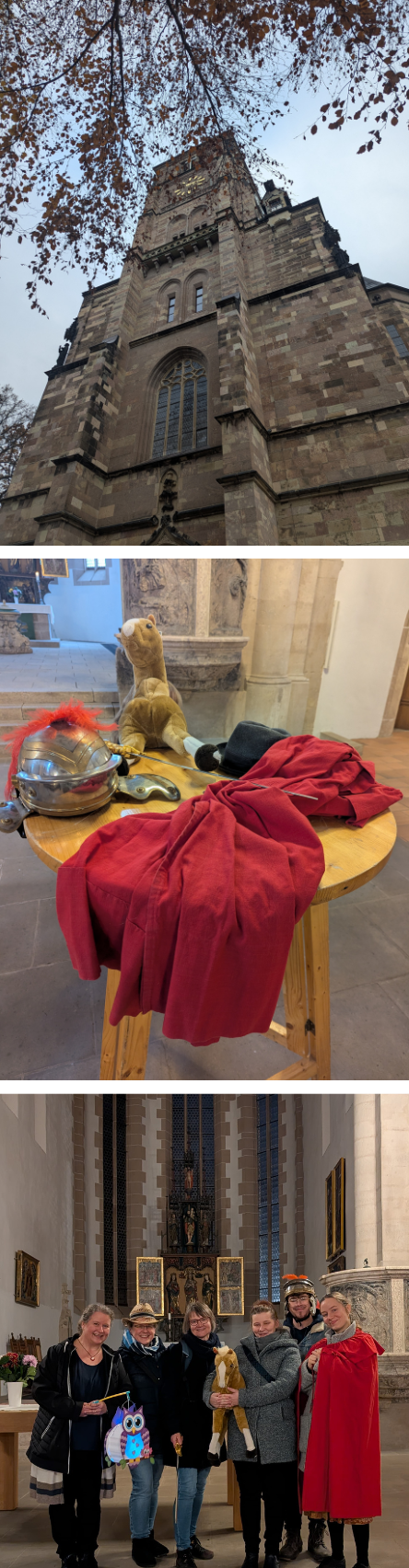 Am 8. November 2025 fand in der Schlosskirche das traditionelle Martinsfest statt, das auch in diesem Jahr viele Familien, Kinder und Gemeindemitglieder zusammenführte. Zu Gast waren die besonderen „Hauptakteure“ der Martinsgeschichte – Pferd, Hut, Helm, Mantel und Schwert. Jede dieser Figuren erzählte aus ihrer eigenen Perspektive, wie sie den berühmten Moment am Stadttor von Amiens erlebt hatte.