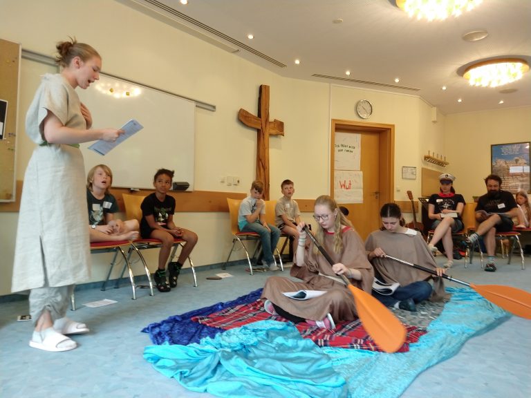 Die Woche stand unter dem Thema „Das geheimnisvolle Logbuch – Geschichten über Angst und Mut aus der Bibel“. Ein wichtiges Thema. Jeden Tag gab es eine Einheit zu einer bestimmten Angst und eine passende mutmachende Bibelgeschichte dazu. In Kleingruppen wurde das Gespräch vertieft und die Kinder konnten persönlich berichten, was ihnen Angst macht. Zusammen wurde gesammelt, welche Strategien und Möglichkeiten es gibt, um Ängste zu bearbeiten oder sogar überwinden zu können.